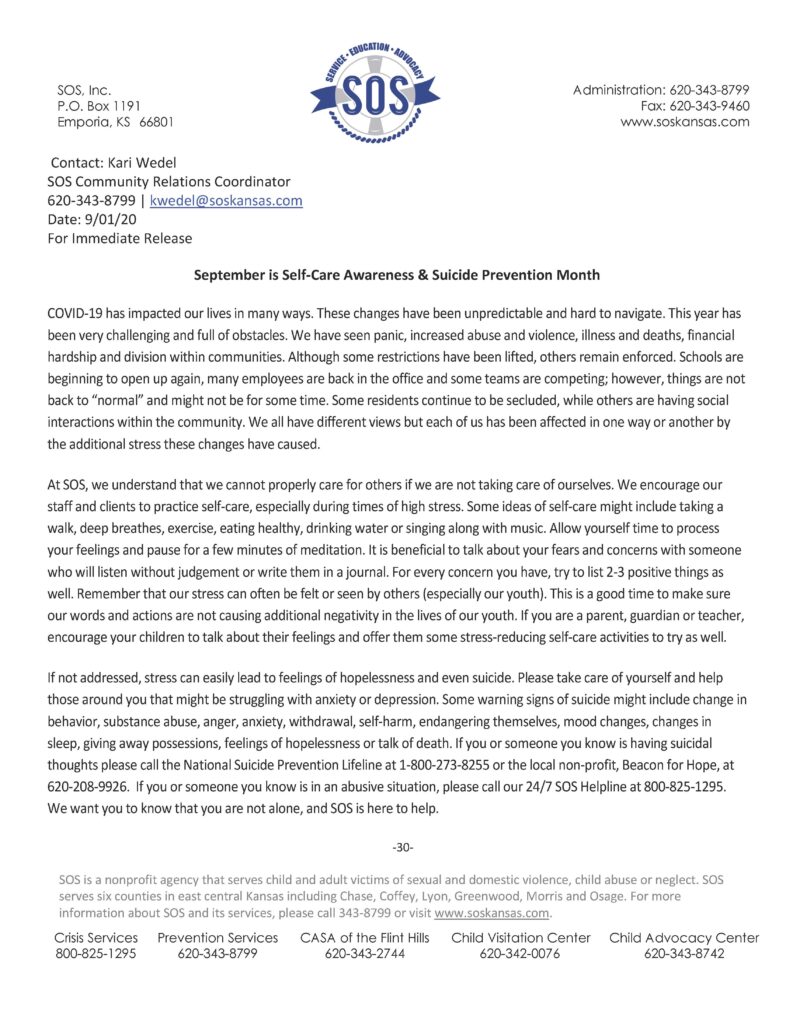 Coffey County News Self-Care Awareness & Suicide Prevention Month September 9, 2020September 14, 2020 JoAnn